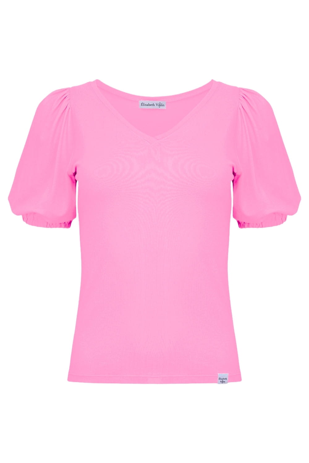 VIVA - Aurora Pink - bambusowa taliowana bluzka z dekoltem w serek i krótkimi rękawami z bufkami zakończonymi gumką