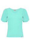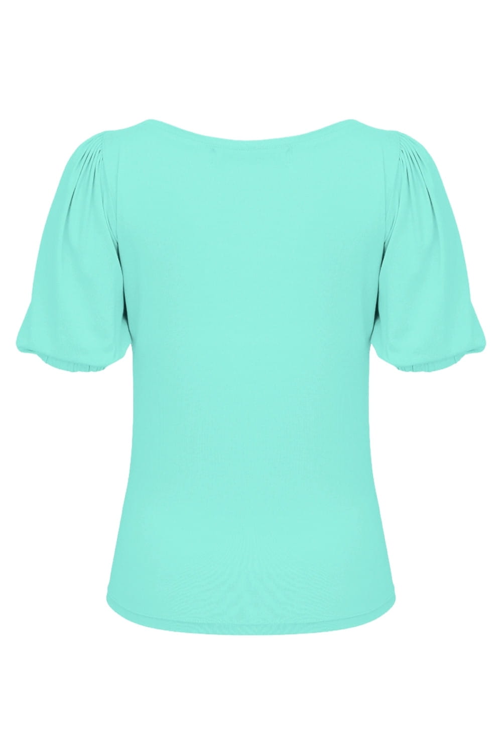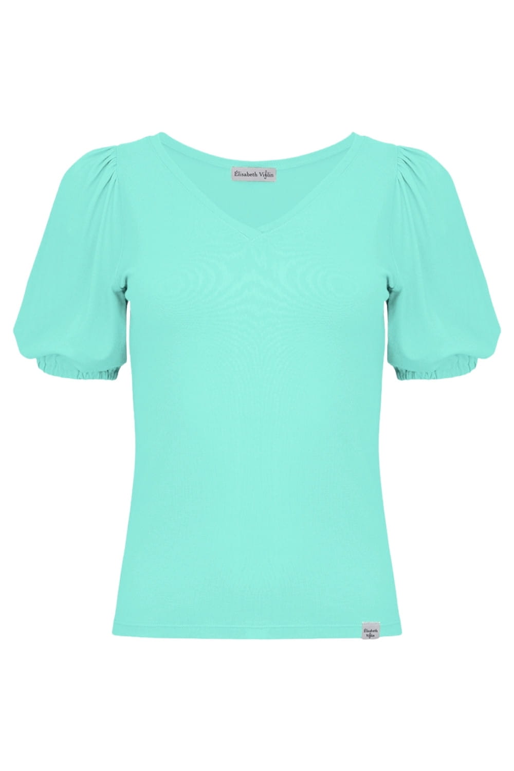 VIVA - Blue Turquoise - wiskozowa taliowana bluzka z dekoltem w serek i krótkimi rękawami z bufkami zakończonymi gumką
