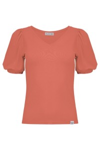 VIVA - Faded Rose - bambusowa taliowana bluzka z dekoltem w serek i krótkimi rękawami z bufkami zakończonymi gumką