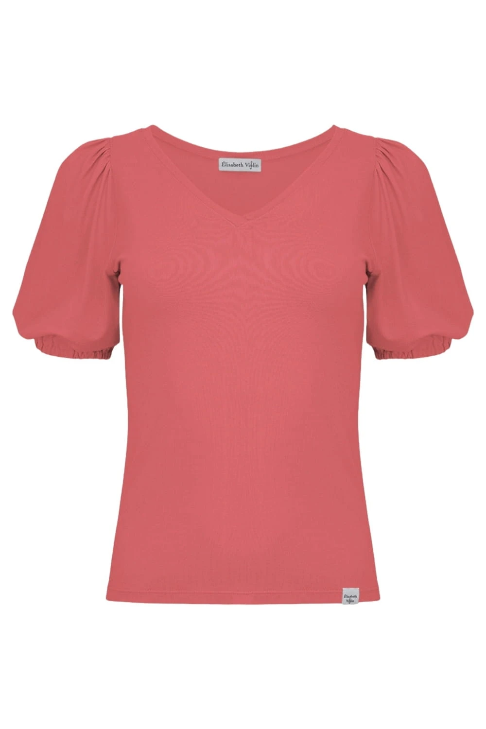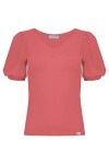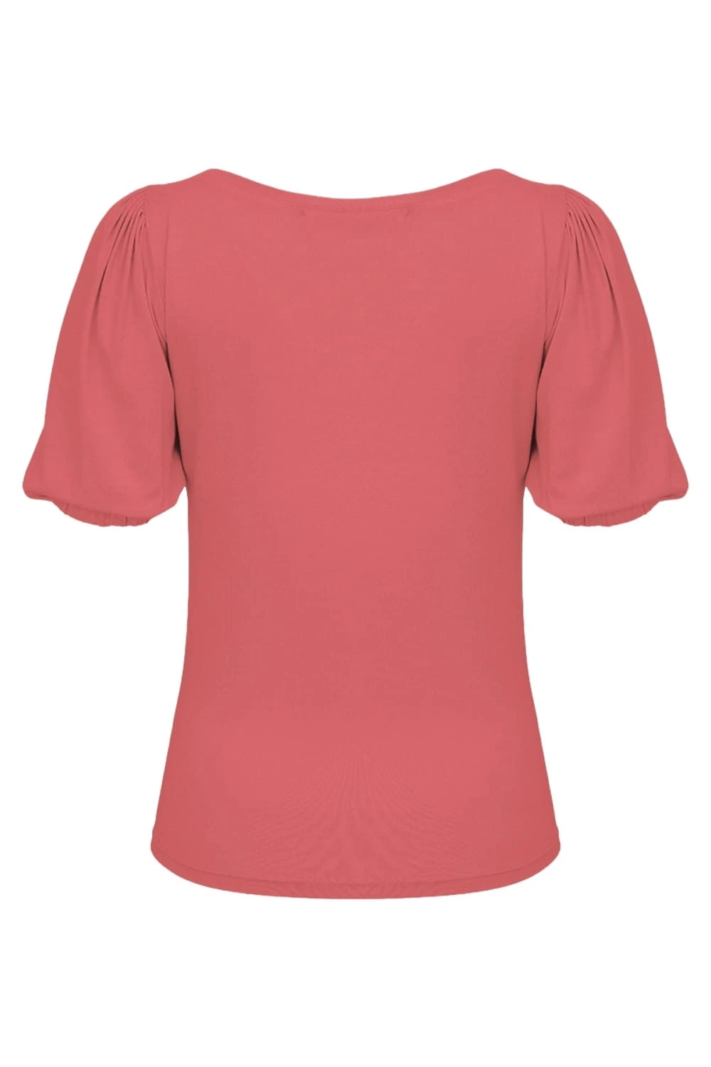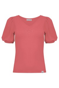 VIVA - Garnet Rose - wiskozowa taliowana bluzka z dekoltem w serek i krótkimi rękawami z bufkami zakończonymi gumką