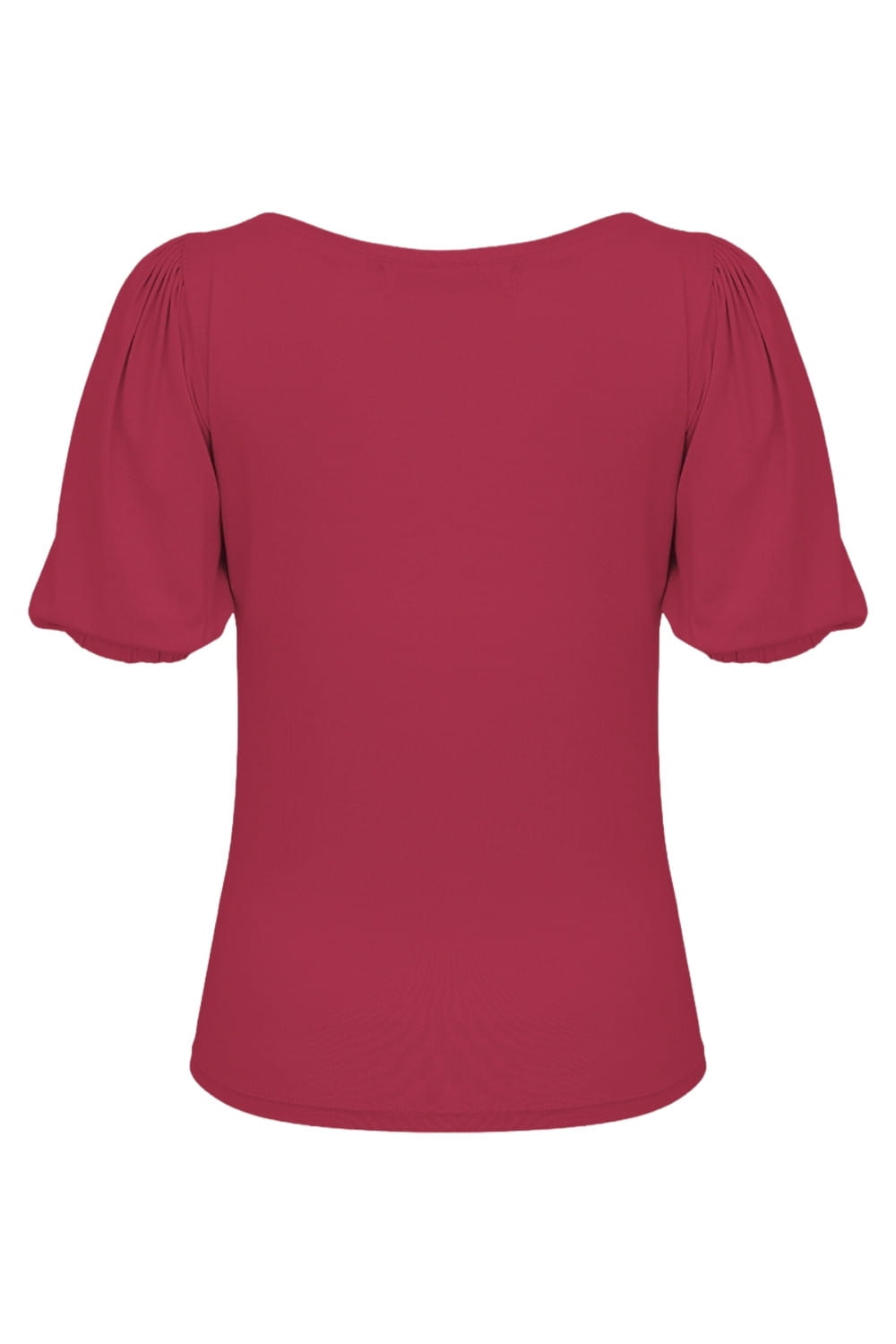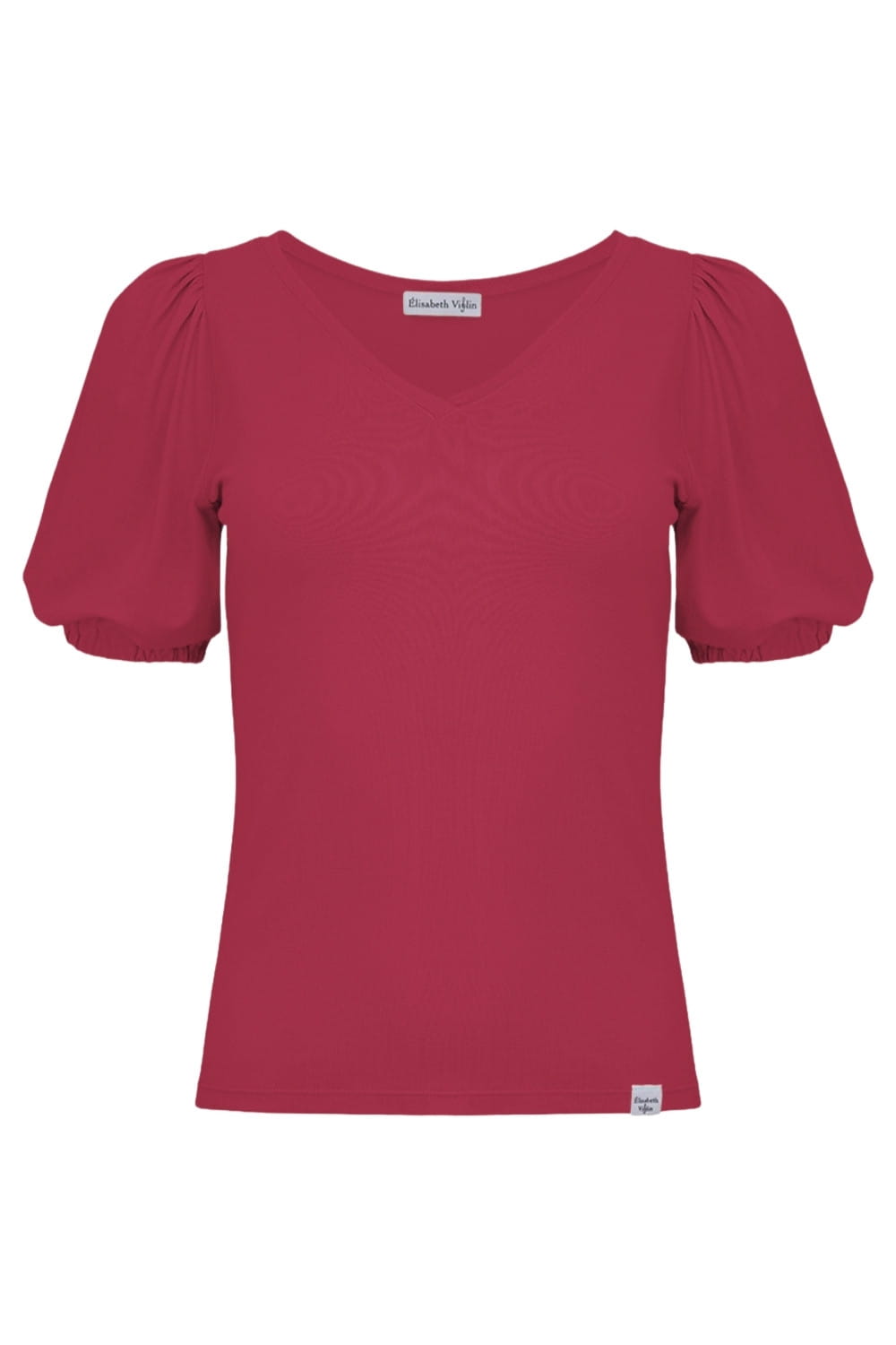 VIVA - Red Bud - wiskozowa taliowana bluzka z dekoltem w serek i krótkimi rękawami z bufkami zakończonymi gumką